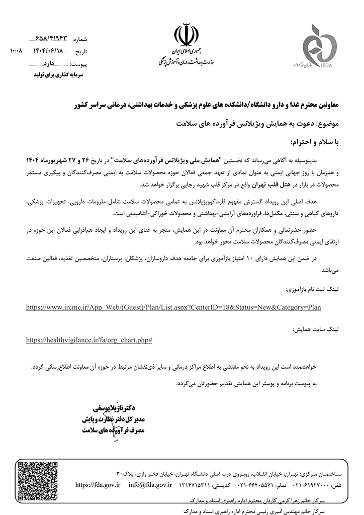 دعوت به همایش ملی ویژیلانس فرآورده های سلامت، مورخ ۲۶ و ۲۷ شهریور ۱۴۰۴ ۲۲ شهریور ۱۴۰۴ | ۱۵:۰۰ کد : ۸۷۹۱ خبر صفحه اول روابط عمومی اخبار اخبار تصویری ارسال به دیگران نام شما ایمیل شما ایمیل دریافتکننده ارسال انصراف تعداد بازدید:۲۷۶ دعوت به همایش ملی ویژیلانس فرآورده های سلامت، مورخ ۲۶ و ۲۷ شهریور ۱۴۰۴