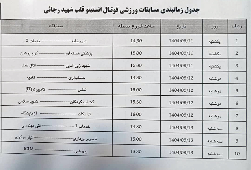 به گزارش اداره روابط عمومی، به همت واحد رفاهی و تربیت بدنی انستیتو قلب و عروق شهید رجایی، رقابتهای فوتبالی میان واحدهای مختلف این مرکز درمانی از روز یکشنبه ۱۱ آذرماه ۱۴۰۴ آغاز شد. این مسابقات با حضور تیمهایی از بخشهای مختلف از جمله داروخانه، خدمات، پزشکی هستهای، اتاق عمل، حسابداری، تغذیه، تدارکات، آزمایشگاه، بیهوشی، ICUA، تنفس، کامپیوتر، کت لب کودکان، شهید سلامی، خدمات، فنی و مهندسی و انبار مرکزی برگزار میشود.